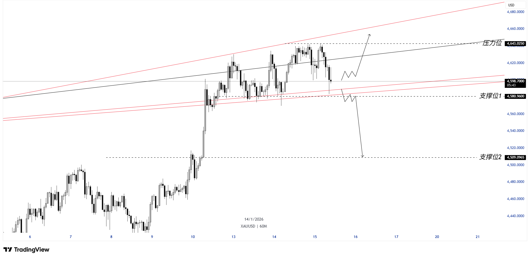 在这一背景下,黄金价格本周一度冲高至 4642 美元附近,技术结构上仍运行在明确的上升通道之中,但短线已显露出高位震荡与回调压力。结合图表结构来看,当前金价自高位回落后,正考验通道中轨与短期趋势支撑区域,约 4600–4580 美元一带构成第一道关键支撑,若该区域能够稳住,价格更可能以高位整理的方式消化前期涨幅,并为后续再度测试 4640 美元上方压力区积蓄动能;反之,若跌破通道下沿及 4580 美元附近支撑,则技术结构将转向更深层的修正,回调目标可能下移至 4510 美元一线,该位置对应前期突破平台与重要结构支撑。值得注意的是,当前走势更符合“强趋势中的高位震荡”特征,而非趋势反转信号,这与基本面尚未出现实质性缓解高度一致。白银方面,价格表现明显强于黄金,反映市场情绪并未完全转向防御,而是处于避险与投机并存阶段,工业属性叠加资金推动,使白银在趋势延续阶段放大波动,同时也提高了短线回撤风险。整体贵金属板块中,铂金与钯金同步走强,显示资金正从单一避险交易向板块化配置扩散,这一现象往往意味着趋势仍在,但波动率将显著上升。综合来看,在地缘政治、美国政治风险与货币政策不确定性未明显缓解之前,黄金的结构性牛市框架尚未被破坏,但从交易角度而言,当前已进入“趋势仍在、节奏更重要”的阶段,价格在高位更可能通过震荡或阶段性回调来释放风险,盲目追高的性价比正在下降,后续需重点关注关键支撑区的得失,以判断牛市是延续还是进入更大级别的整理。来源 :ATFX风险提示:市场有风险,投资需谨慎。