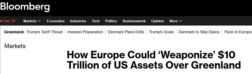彭博社称,若将欧洲所持美国资产“武器化”,将意味着一次严重升级。实际上,这相当于把一场仍在暗流涌动、且投资者去年基本并未太当回事的贸易战,进一步扩展为一场直接冲击资本市场的金融对抗。