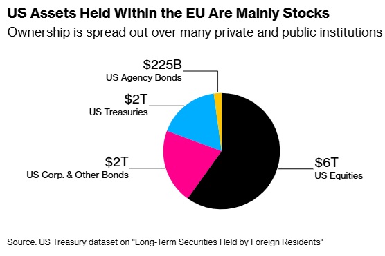 欧洲国家持有数万亿美元的美国债券和股票,其中一部分由公共部门基金持有。这引发市场猜测:作为对特朗普再度掀起关税战的回应,欧洲可能会抛售这些资产。鉴于美国对海外资本的依赖,此举或将推高美国借贷成本、打压股市。