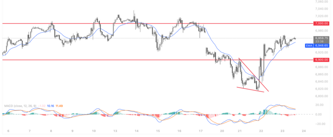 当前价格稳固运行在 6,900 上方,前期关键支撑未被破坏,下行压力已明显缓和;在支撑确认的前提下,指数更多呈现区间内的震荡修复而非趋势反转。只要 6,900 不失,短线结构仍偏向震荡中逐步抬高重心,反弹动能有望延续,但上方仍需关注区间压力位的消化情况。