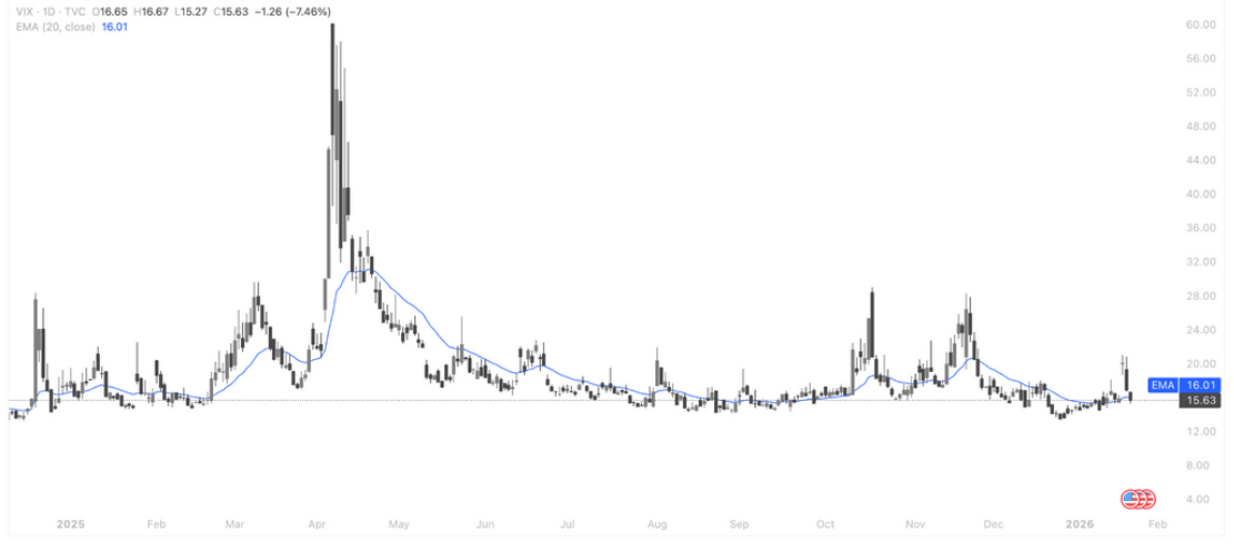 从日线结构看,VIX 在前期情绪冲击高点后持续回落,目前重新贴近 16 一线并运行在 EMA20 附近,显示市场恐慌情绪已明显降温。当前波动率处于历史偏低区间,尚未出现快速抬升的迹象,意味着资金并未对系统性风险进行重新定价。只要 VIX 维持在 16–18 区间内震荡,权益市场仍具备维持反弹与结构性做多的环境;只有当 VIX 再度放量上行并有效站上 20,才需要对风险偏好转向保持更高警惕。