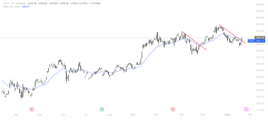 消息面方面,特斯拉 CEO 马斯克在达沃斯释放密集利好,从人形机器人 Optimus、Robotaxi 商业化到 AI 与太空探索,系统性强化了“AI + 机器人 + 自动驾驶”的长期增长叙事。Optimus 已进入工厂实用阶段并有望明年底对外销售,Robotaxi 在美国的无监督测试推进,显著提升了市场对其第二、第三增长曲线的预期,成为推动股价走强的核心催化。