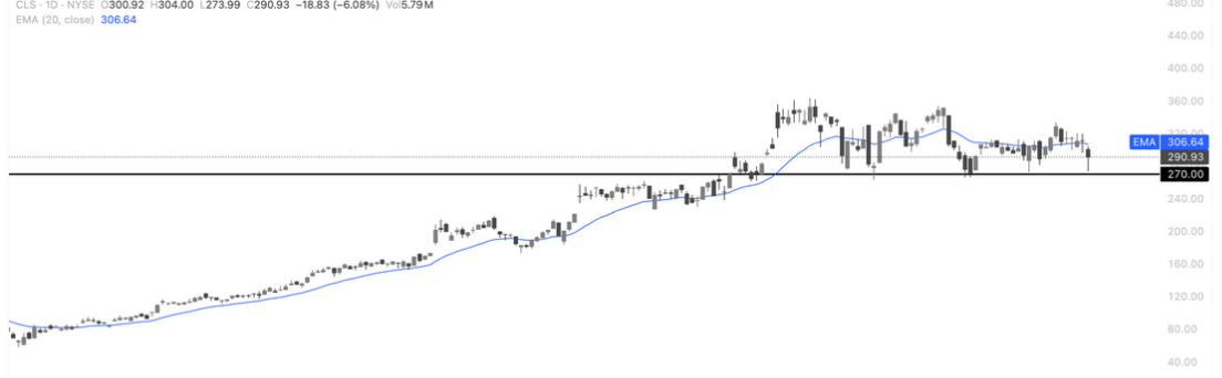 CLS 在高位进行技术性回踩与换手。只要 270 支撑不被有效跌破,调整应视为中期布局窗口而非风险信号;后续若重新站回 EMA20 并企稳,股价有望回到震荡上行节奏,等待基本面催化再次发力。