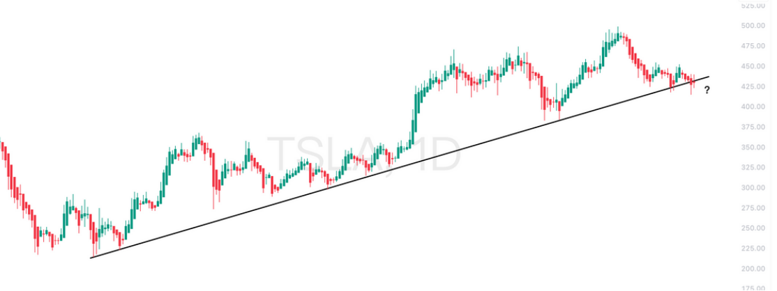 从日线结构看,特斯拉仍处于完整的上升趋势中,当前价格回落至长期上升趋势线附近,属于趋势中的正常回踩。此前高位冲高回落后,动能有所降温,短期进入震荡消化阶段,市场正在验证下方趋势支撑的有效性。