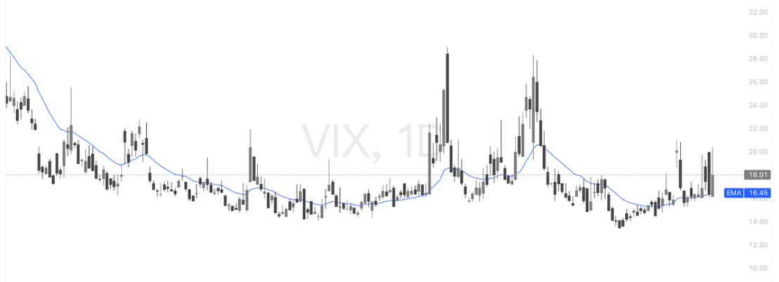 从结构上看,VIX 已结束此前长时间的低位震荡,下沿抬升并成功站上 EMA,短期波动率趋势由“压制”转向“释放”。这一轮拉升并非单日脉冲,而是伴随更高的低点逐步走高,说明市场避险需求正在积累。