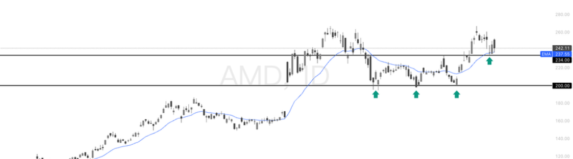 财报后夜盘约 8% 的下跌,意味着下一根日线大概率将以跳空或长阴线的方式,直接考验 234这一关键支撑。这将是一次“延迟体现的回踩确认”:若夜盘跌幅在日线开盘后被迅速收复,则属于典型的利空兑现、强势趋势中的洗盘;反之,若日线收盘有效跌破 234(前平台)并站不回EMA,则说明财报后的资金出逃尚未结束,技术结构将由“突破后回踩”转向“假突破+区间回落”,下方空间随即打开至 220,极端情况下回测 200。