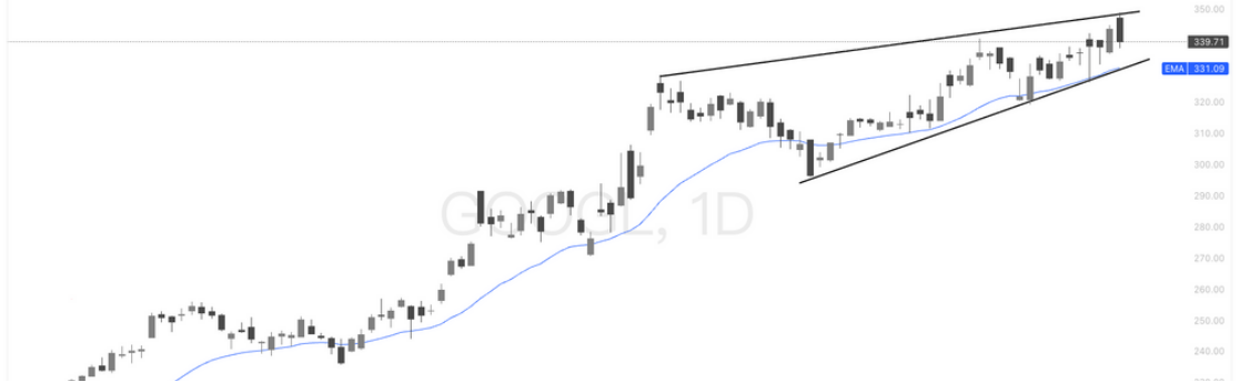 从日线结构看,股价仍运行在上升通道内,趋势尚未被破坏;但当前已接近上轨压力区(345–350),在财报前形成明显的“位置偏高、波动待释放”状态。若财报与指引确认云利润率上行且CapEx可控,价格有望放量突破上轨,打开新高空间;反之,若CapEx上修或云端利润兑现不及预期,技术面更可能走财报后回踩,首先测试 EMA/通道下轨(331附近)。