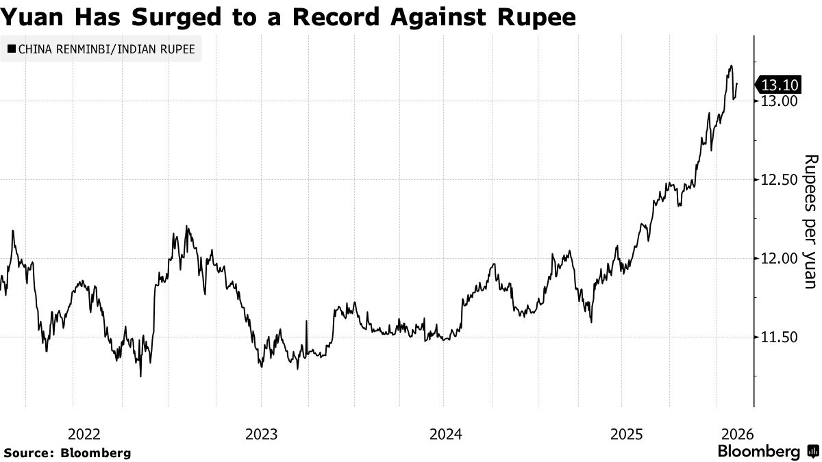 人民币的上涨也发生在两国试图修复经济关系的背景下。2020年致命边境冲突曾令双边关系紧张。根据中国海关数据,印度对华贸易逆差在2025年扩大至创纪录的1160亿美元,这是印度对所有贸易伙伴中的最大逆差。