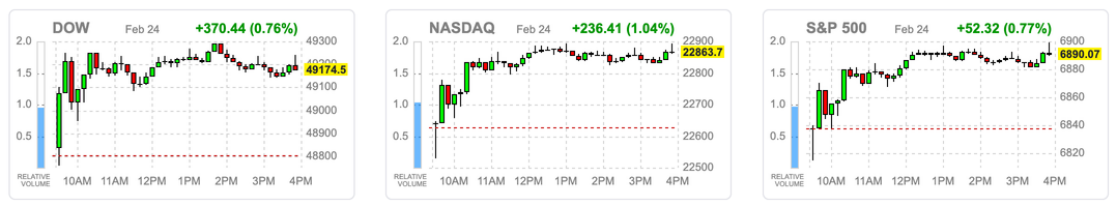 昨夜美股三大指数同步上涨,软件板块情绪明显修复。此前引发市场担忧的AI替代逻辑出现缓和,AI公司转向“协同而非取代”的表态推动软件股整体反弹,资金重新回流成长板块。指数层面呈现结构性修复特征,而非情绪性暴涨,市场风险偏好边际回暖。