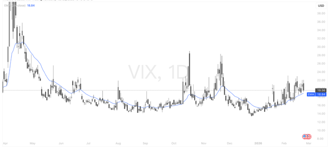 VIX日线自年初低位反弹后持续震荡上行,目前重新站上20附近并运行于上升中的20EMA之上,显示市场对未来波动的定价正在回升。整体结构仍处中低波动区间,但若VIX继续上破并维持在20上方,通常意味着风险资产短线波动将加剧,股市可能进入震荡或回调阶段;反之若再次跌回18下方,则代表风险偏好修复、市场情绪趋稳。当前核心观察点:VIX是否形成趋势性上行。