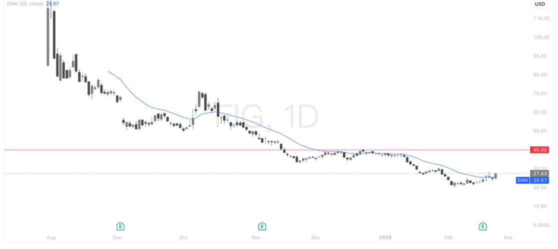 FIG日线仍处长期下行趋势之中,40美元为中期关键压力位,多次反弹受阻显示空头结构尚未完全扭转。不过近期股价在20–25美元区间明显止跌企稳,波动收敛且价格开始尝试站回20EMA上方,短线动能出现修复迹象;若能持续守稳并形成更高低点结构,走势有望由下跌转入筑底并指向40美元区域,否则一旦跌破近期低点,弱势趋势仍将延续,当前核心观察点是能否稳定站上20EMA并抬升结构。