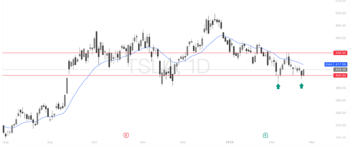 TSLA日线目前处于区间下沿震荡阶段,400美元成为关键支撑位(多次回踩出现买盘承接),短线结构呈现止跌企稳迹象,但价格仍运行在下行的20EMA下方,整体趋势尚未转强。若后续能够守稳400并重新站上417一线均线压制,行情有望向上修复并挑战436阻力;但一旦有效跌破400,结构将转弱并打开进一步下行空间,当前核心观察点是400支撑是否继续有效。