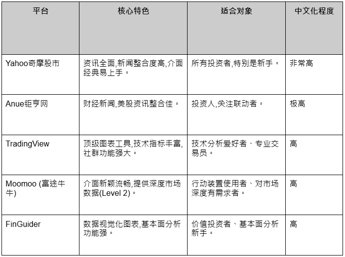 作为老牌的财经资讯网站,Yahoo股市的优势在于其资讯的广度与全面性。它不仅提供即时的美股最新行情,还整合了大量相关新闻、财报日历与分析师评级。对于刚入门的投资者来说,其经典的介面非常容易上手,是建立市场全局观的好起点。